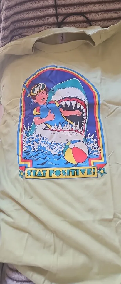 Dive into summer humor with this playful “Stay Positive” tee, featuring a retro-inspired design of a cheerful snorkeler giving a thumbs-up while a giant shark sneaks up behind him. The comic-style artwork and bold color palette capture that perfect mix of optimism and absurdity — a true statement piece for anyone who enjoys ironic retro fashion.